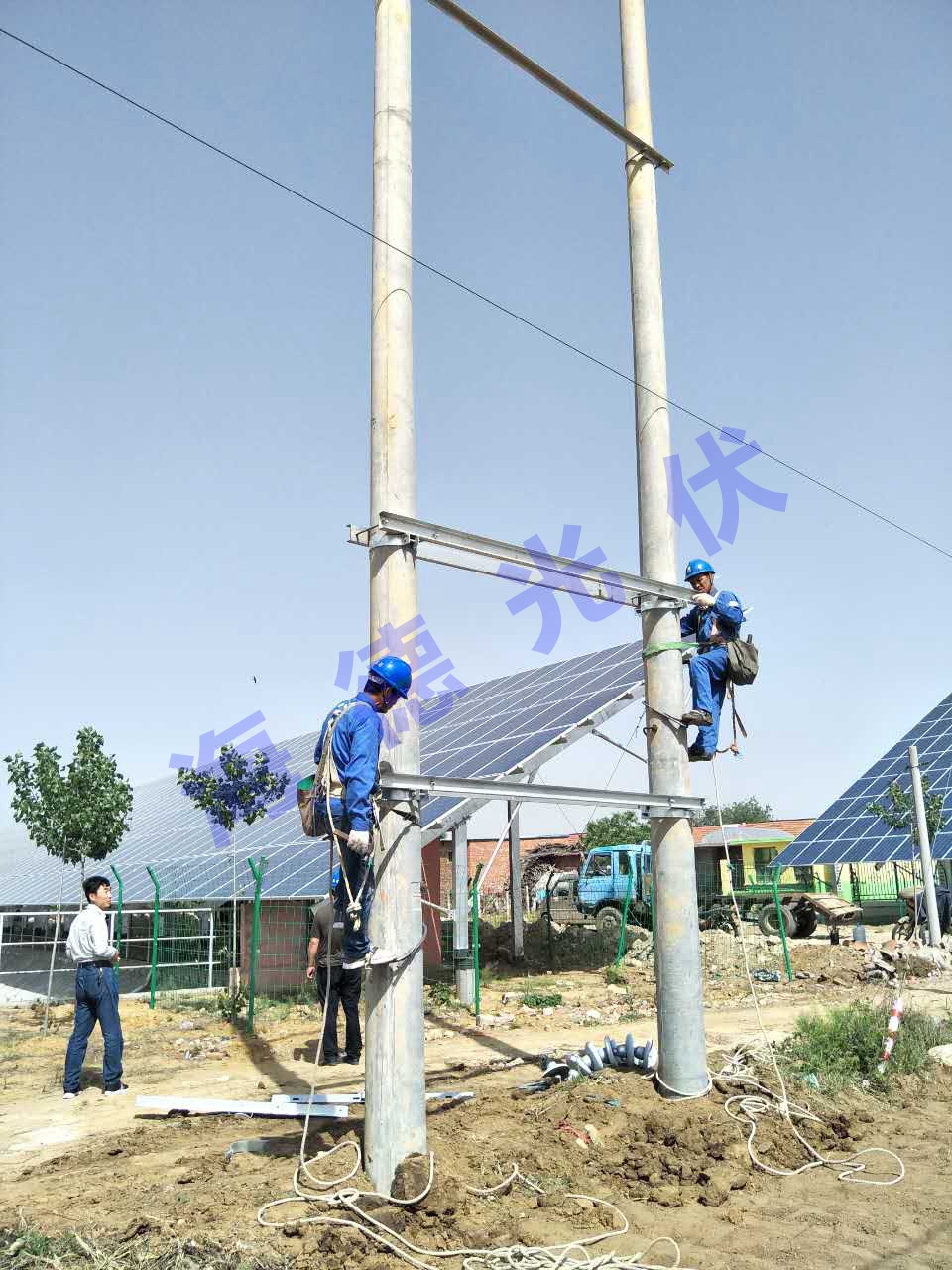 施工人员正在小心翼翼的将电池板安装加固。我们采用同行业领先水平的晶体硅光伏组件,采用严格的国际标准质量管理体系,施行严苛的环境测试,确保我们的光伏组件光电转换稳定,使用寿命长久。