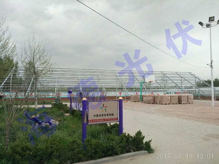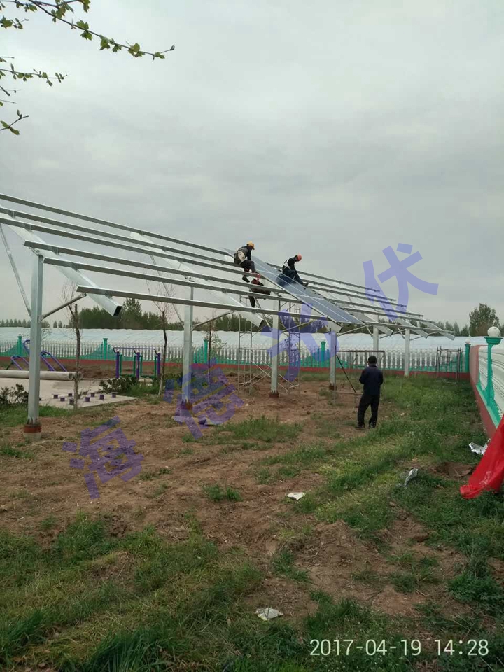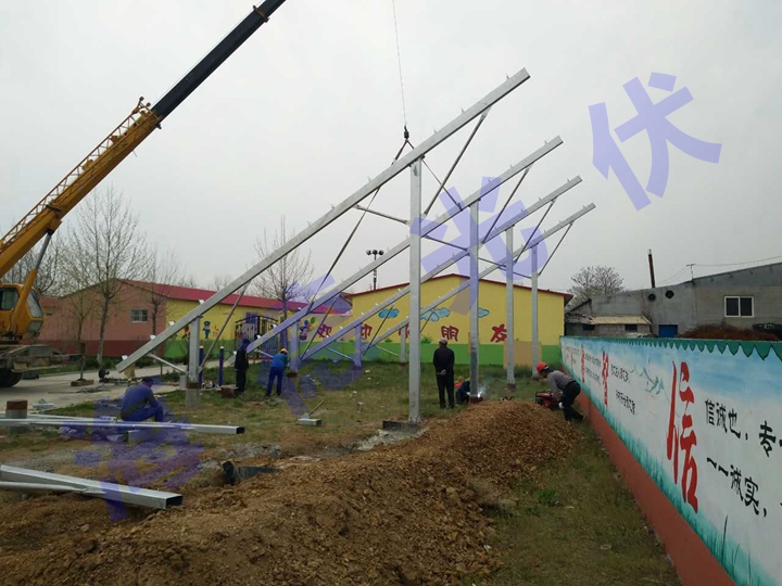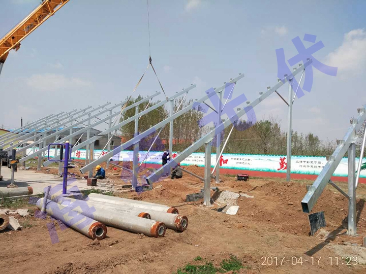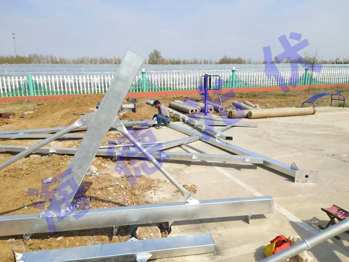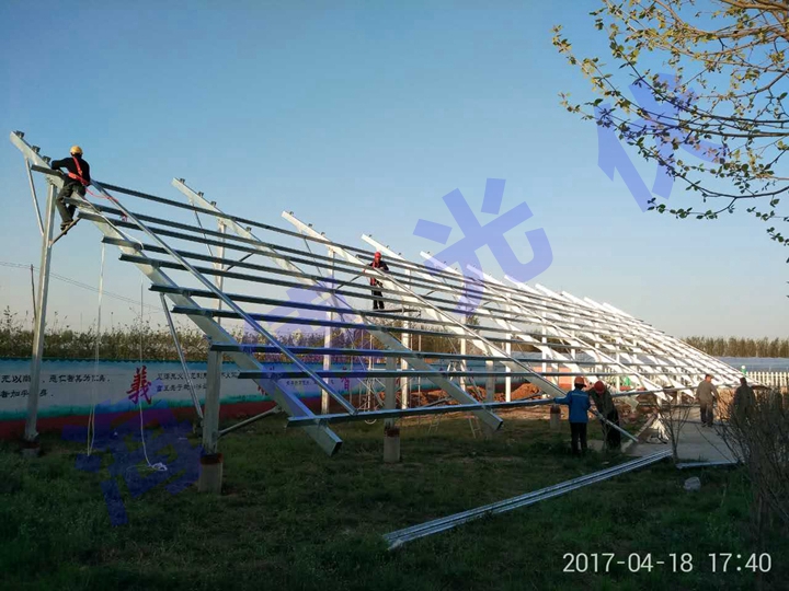 光伏支架进场组装,表层为热镀锌的碳素钢光伏支架,坚固耐用抗腐蚀,使用寿命可达二十年以上。
