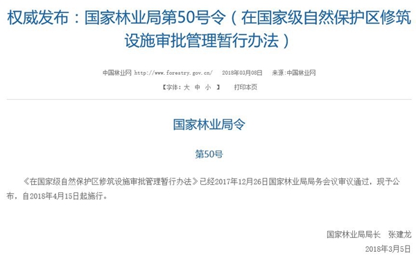 3月8日,国家林业局发布《在国家级自然保护区修筑设施审批管理暂行办法》。其中,明确禁止在国家级自然保护区修筑光伏发电、风力发电、火力发电等项目。自2018年4月15日起施行。