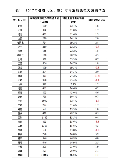 2017年,包含水电在内,全部可再生能源电力消纳量为16686亿千瓦时,同比增加10.8%,占全社会用电量的比重为26.5%,同比上升1.1个百分点。综合考虑各省(区、市)本地生产、本地利用以及外送电力消纳量情况,2017年各省(区、市)可再生能源电力消纳量占本地区全社会用电量的比重如下:
