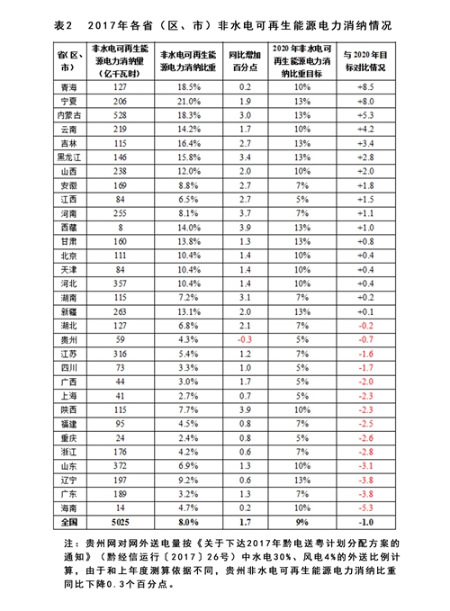 2017年,全国非水电可再生能源电力消纳量为5025亿千瓦时,同比增加35.2%,占全社会用电量比重为8.0%,同比上升1.7个百分点。综合考虑各省(区、市)本地生产、本地利用以及外送电力消纳可再生能源电量情况,2017年,各省(区、市)非水电可再生能源电力消纳量占本地区全社会用电量的比重如表2。