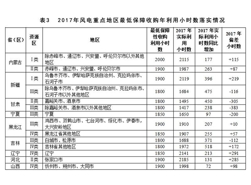 2017年,全部规定风电最低保障收购年利用小时数的地区的风电实际发电小时数较2016年均增加,但新疆Ⅲ类资源区、甘肃、宁夏、吉林Ⅲ类资源区未达到风电最低保障收购年利用小时数要求。其中,甘肃Ⅱ类和Ⅲ类资源区实际利用小时数与最低保障收购年利用小时数偏差分别为-305小时和-383小时;宁夏由于来风情况偏差,偏差为-200小时;新疆Ⅲ类资源区和吉林Ⅲ类资源区偏差分别为-116小时和-112小时。其他地区达到风电最低保障收购年利用小时数要求。