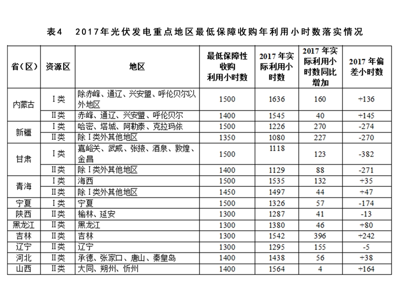2017年,内蒙古、青海、黑龙江、吉林、山西II类地区、河北II类地区达到光伏发电最低保障收购年利用小时数要求,五个省(区)未达到要求,其中,甘肃I类和II类地区实际利用小时数与最低保障收购年利用小时数偏差分别为-382小时和-271小时,新疆I类和II类地区偏差分别-274小时和-270小时,宁夏偏差-174小时,陕西II类地区偏差-13小时,辽宁偏差-5小时。