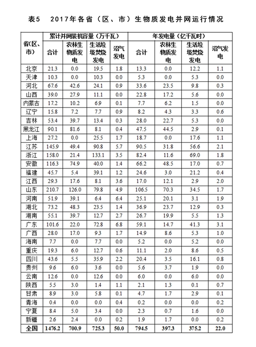 截至2017年底,全国共有30个省(区、市)投产了747个生物质发电项目,并网装机容量1476.2万千瓦(不含自备电厂),年发电量794.5亿千瓦时。其中农林生物质发电项目271个,累计并网装机700.9万千瓦,年发电量397.3亿千瓦时;生活垃圾焚烧发电项目339个,累计并网装机725.3万千瓦,年发电量375.2亿千瓦时;沼气发电项目137个,累计并网装机50.0万千瓦,年发电量22.0亿千瓦时。生物质发电累计并网装机排名前四位的省份是山东、浙江、江苏和安徽,分别为210.7万、158.0万、145.9万和116.3万千瓦;年发电量排名前四位的省份是山东、江苏、浙江和安徽,分别是106.5亿、90.5亿、82.4亿和66.2亿千瓦时。2017年各省(区、市)各类生物质发电并网装机及发电量如下:
