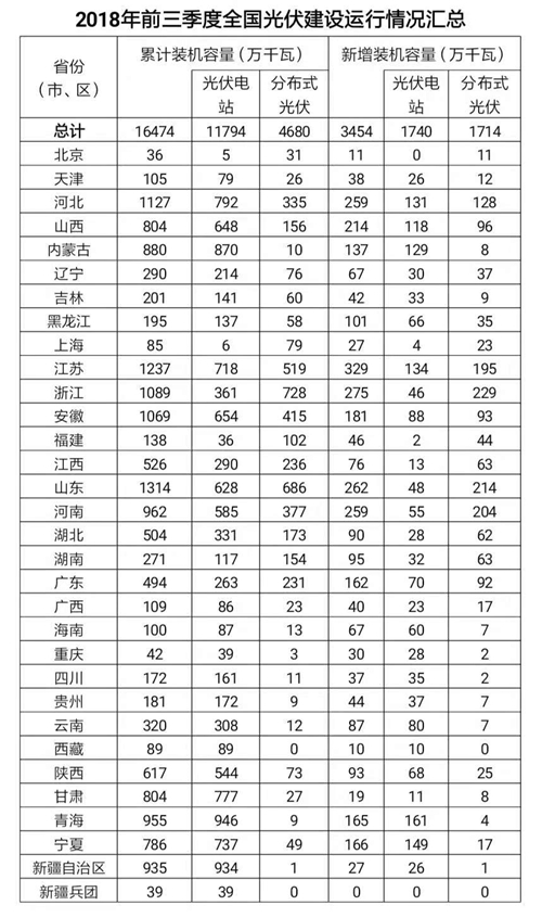 全国各省(区、市)2018年前三季度光伏建设运行情况详见附表: