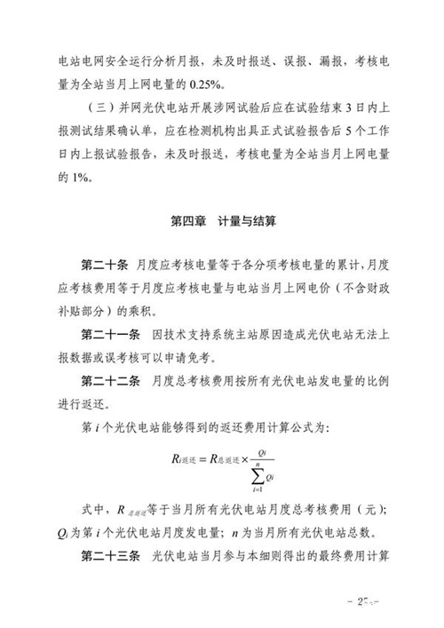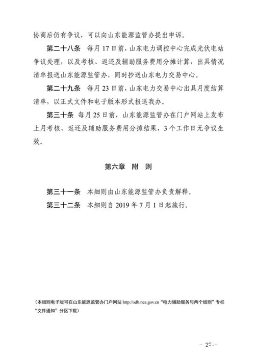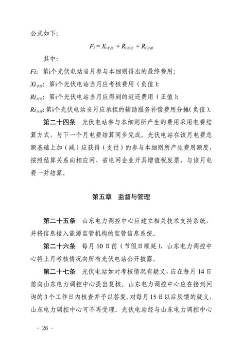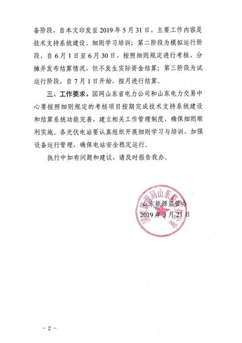 三、工作要求。国网山东省电力公司和山东电力交易中心要按照细则规定的考核项目按期完成技术支持系统建设和结算系统功能完善,建立相关工作管理制度,确保细则顺利实施。各光伏电站要认真组织开展细则学习与培训,加强设备运行管理,确保电站安全稳定运行
