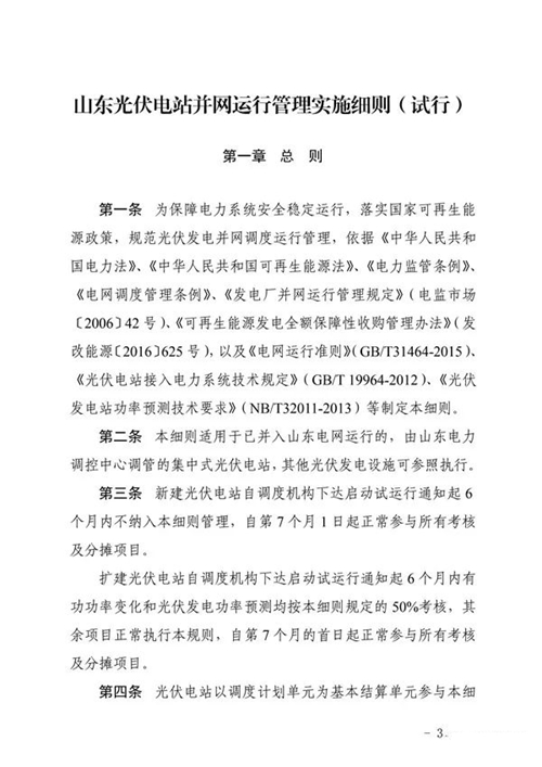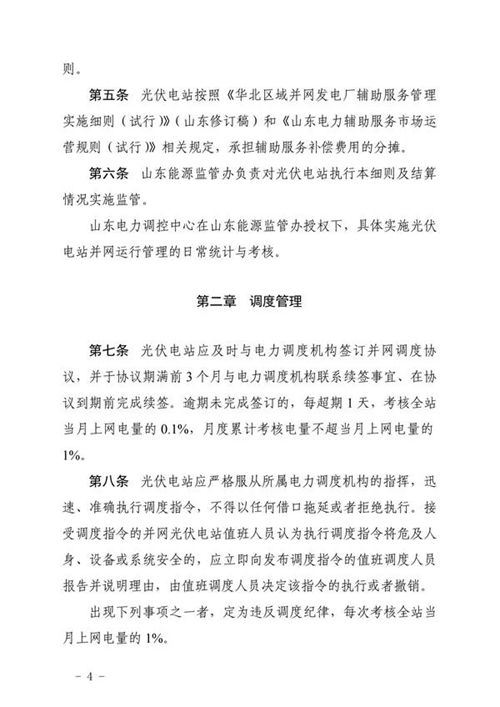 国网山东省电力公司,华能山东发电有限公司、华电山东公司、国家能源集团山东公司、大唐山东发电有限公司、华润电力华东大区、国家电投山东分公司,山东电力交易中心,各有关发电企业:为保障全省电力系统安全稳定运行,规范光伏电站调度运行管理,推进光伏发电行业健康持续发展,我办制定了《山东光伏电站并网运行管理实施细则(试行)》。现印发你们,并就细则实施安排如下,请遵照执行。