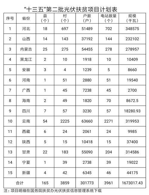 一、本次共下达15个省(区)、165个县光伏扶贫项目,共3961个村级光伏扶贫电站(以下简称电站),总装机规模1673017.43千瓦,帮扶对象为3859个建档立卡贫困村的301773户建档立卡贫困户。