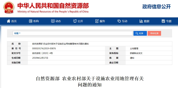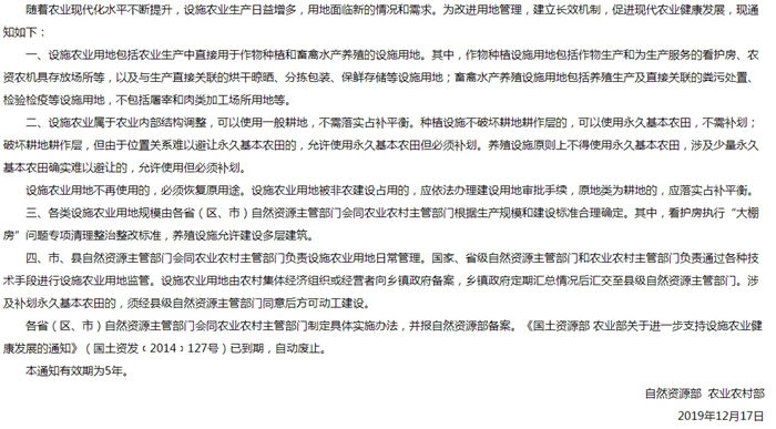 近日,国土资源部官方网站发布了《自然资源部、农业农村部关于设施农业用地管理有关问题的通知》,通知有效期为5年。