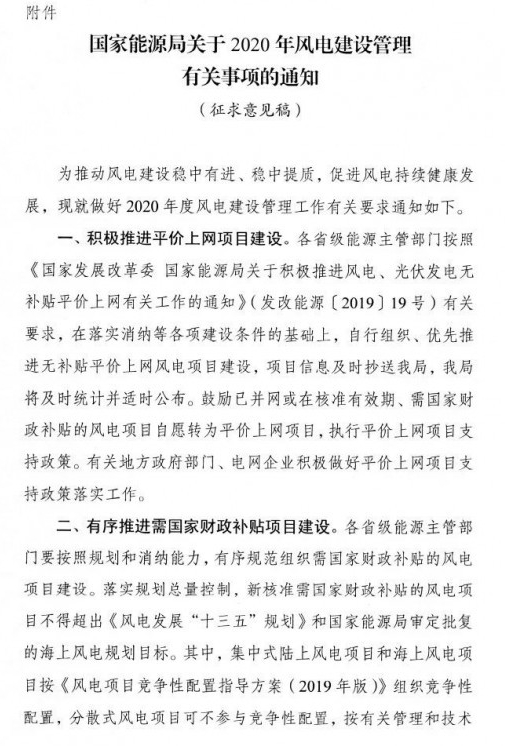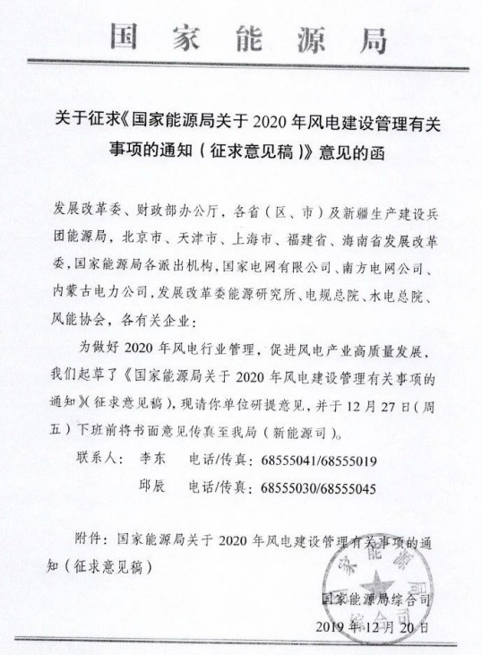 近日,国家能源局下发《关于征求2020年风电建设管理有关事项的通知(征求意见稿)的函》,就2020年风电建设管理政策,向相关主管部门、机构、企业广泛征求意见。