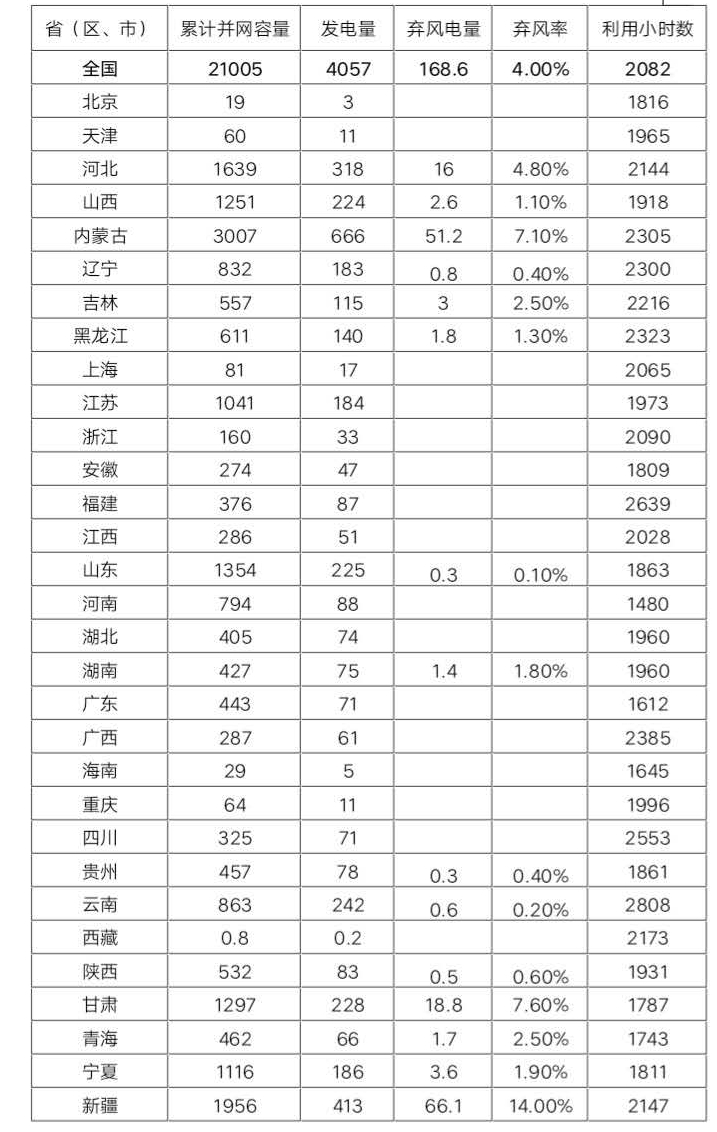 2019年,全国风电平均利用小时数2082小时,风电平均利用小时数较高的地区是云南(2808小时)、福建(2639小时)、四川(2553小时)、广西(2385小时)和黑龙江(2323小时)。2019年弃风电量169亿千瓦时,同比减少108亿千瓦时,平均弃风率4%,同比下降3个百分点,弃风限电状况进一步得到缓解。