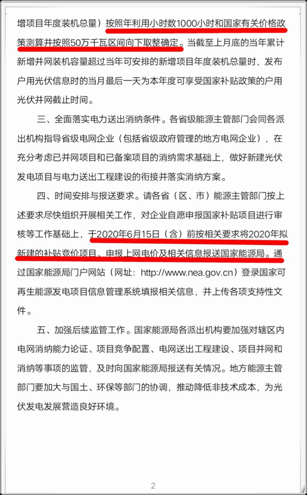 二、国家电网有限公司、南方电网公司、内蒙古电力公司要会同新能源消纳监测预警中心及时测算论证经营区域内各省级区域2020年风电、光伏发电新增消纳能力,报国家能源局复核后于3月底前对社会发布;做好新建风电、光伏发电项目与电力送出工程建设的衔接并落实消纳方案;发挥电网并网关口作用,严格按照规划和消纳能力合理安排项目并网时序。