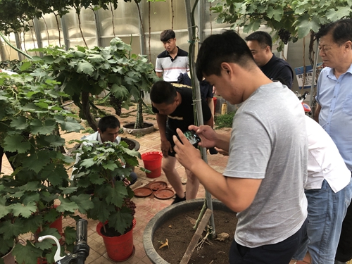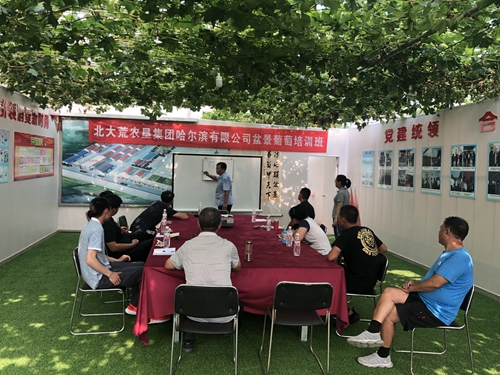 7月15日,作为上次来访的延续,以及今后合作的预热,黑龙江北大荒农垦集团哈尔滨有限公司特别选派8名技术人员,在闫平科长的带领下,风尘仆仆,不远千里,到访我农业公司沙北头园区,开展为期三天的进修学习培训活动。这是我农业公司——青岛沙北头农业科技有限公司实施与北大荒农垦集团哈尔滨有限公司战略合作的内容之一,借助其在葡萄种植领域的经验和优势,为北大荒农垦集团培养盆景葡萄技术及管理人才,实现双方合作共赢。