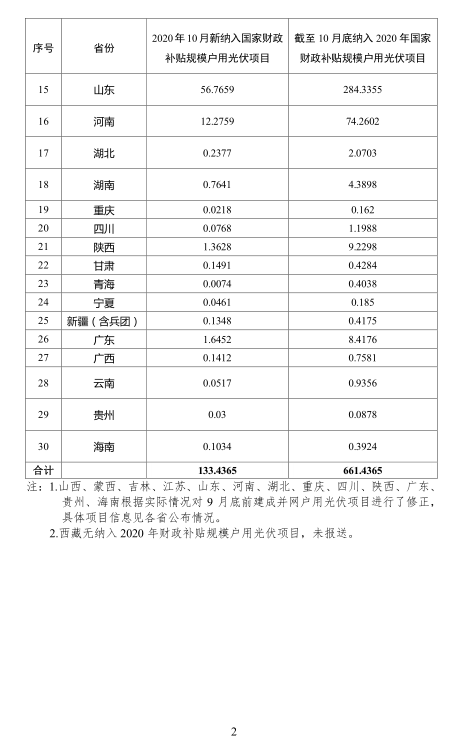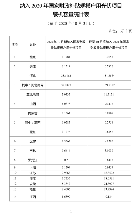 经国家可再生能源信息管理中心梳理统计,2020年10月新纳入国家财政补贴规模户用光伏项目总装机容量为133.44万千瓦。截至10月底,全国累计纳入2020年国家财政补贴规模户用光伏项目装机容量为661.44万千瓦,已超过2020年度可安排的600万千瓦新增项目年度装机总量,为保障行业平稳健康发展,2020年11月30日为纳入2020年国家财政补贴规模户用光伏项目并网截止日期。
