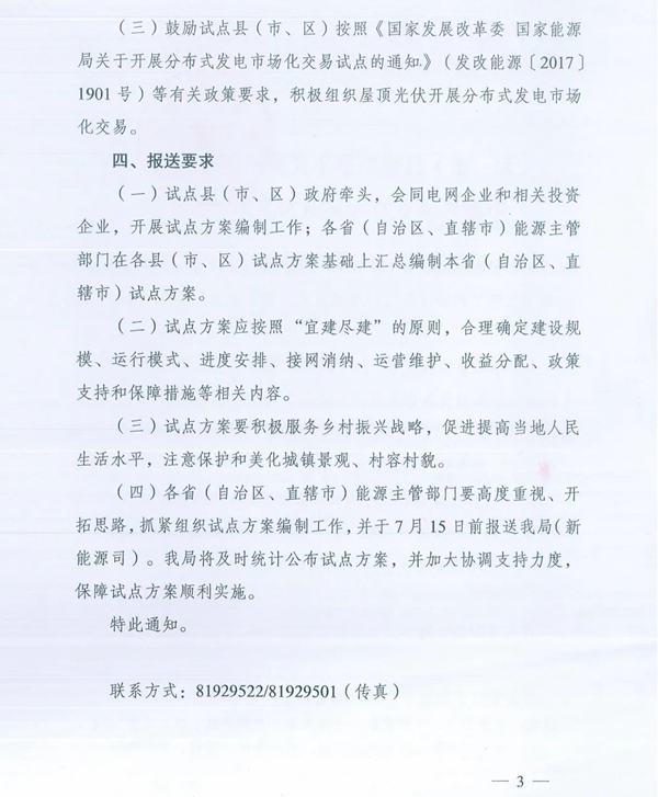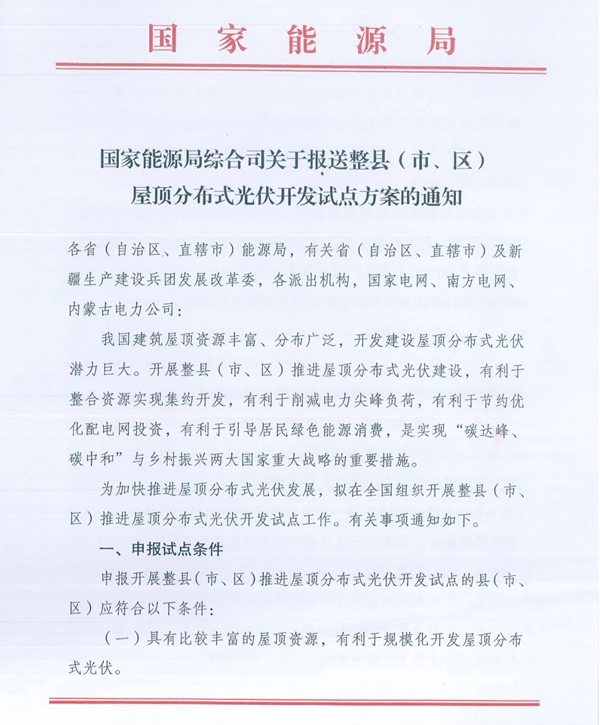 国家能源局发布报送整县(市、区)屋顶分布式光伏开发试点方案的通知