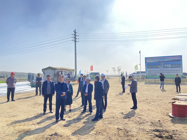 施工现场,项目负责人邓振文向来访的各位领导详细介绍了崔家集项目的基本概况,包括安装容量、占地面积、项目规模、工程进度、施工管理、发展前景等一系列情况,让各位来访领导对于崔家集光伏发电项目的现状及前景都有了基本的了解和认识。崔家集现代光伏农业项目,地上光伏发电属于国家大力扶持的新能源行业,地面开展农业种植,邓振文又从“农业+光伏”的双重角度向各位领导介绍了项目未来的方向及发展意义,对于改善优化地区能源结构、推动特色农业发展都具有重要的推动作用。